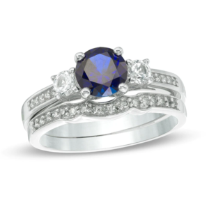 6.0mm Blue and White Sapphire with 1/8 CT. T.W. Diamond Three Stone Bridal Set in 10K White Gold